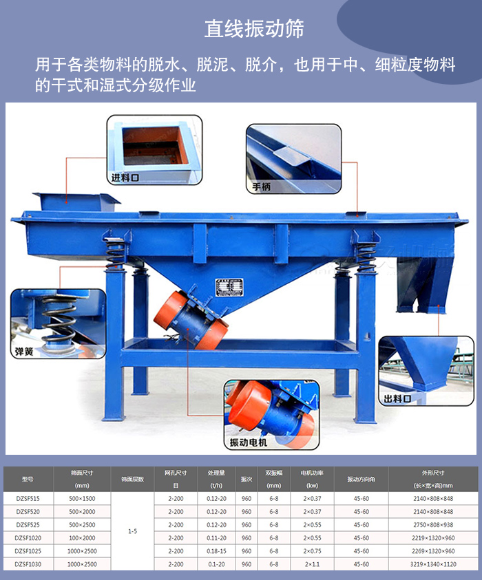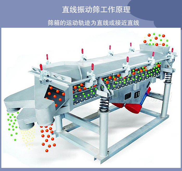 直线振动筛筛箱的运动轨迹为直线或接近直线,它有两个轴,所以又称双轴振动筛。直线振动筛水平或倾斜安装,这类振动筛结构紧凑,运行平稳,被广泛用于各类物料的脱水、脱泥、脱介,也用于中、细粒度物料的干式和湿式分级作业。我厂生产的直线振动筛种HZSF型号就是直线振动筛代表性的产品。