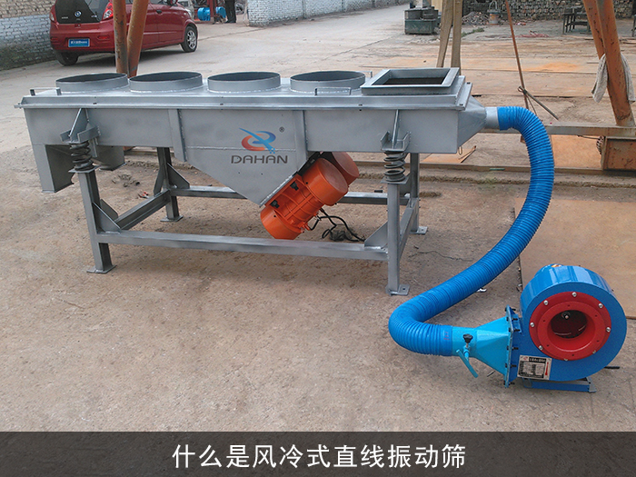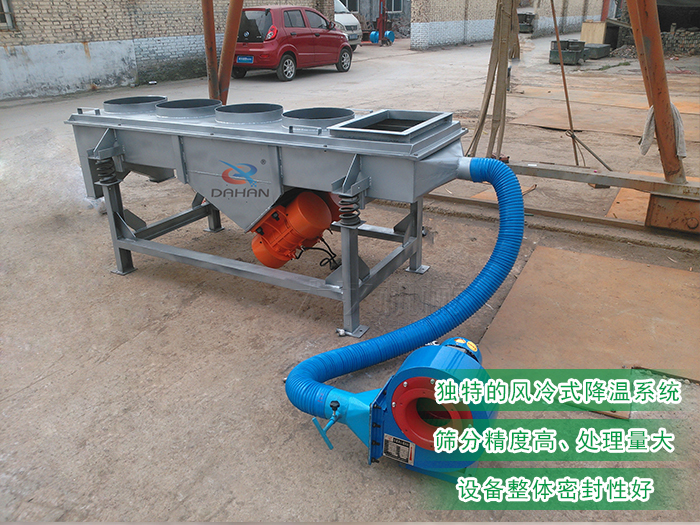 风冷式直线振动筛在进料口底部或箱体下侧端增加了风机降温冷却系统,在进料口加装筛网及小型排料口使大颗粒结块物料从小型排料口中排出,该装置可有效拦截大颗粒并缓冲物料对筛网的冲击,延长筛网使用寿命,在物料在进入设备时,位于进料口底部或箱体下侧端的风机降温冷却系统对其进行降温作业,在激振力和物料自重力的合理作用下,降温后的物料在筛面上被抛起、跳跃式向前做直线运动,通过多层筛网过滤不同规格的筛上物及筛下物,分别从各层的出料口排出,达到筛选和分级的目的。