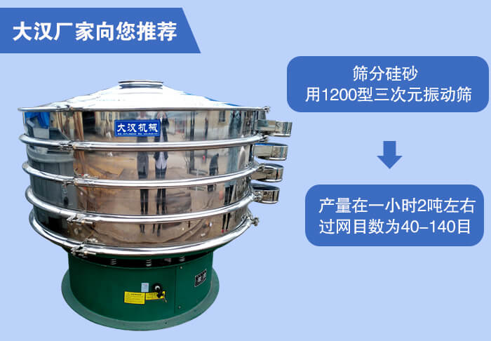 近期有客户询问我们销售客服问筛分烘干后的硅砂产量在一小时2吨左右,过网目数为40-70目、70-140目适合用什么型号的振动筛,小编根据客户所筛分的物料与过网数目和产量推荐使用1200型三次元振动筛