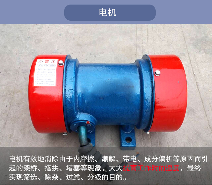 振动电机的高速转动,使筛体周期性高频振动,有效地消除由于内摩擦、潮解、带电、成分偏析等原因而引起的架桥、搭拱、堵塞等现象,大大提高工作时的速度,最终实现筛选、除杂、过滤、分级的目的。