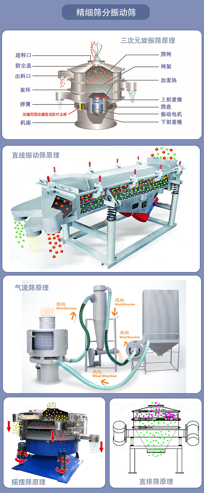 振动筛又被叫做筛粉机、电动筛,是一种适合与精细物料筛分的振动筛分机械设备,被各行各业所广泛使用,尤其体现在食品行业和化工行业的生产活动中。振动筛设备分类广泛,精细筛分设备是用处最广的,那么小编今天就和大家分享精细筛分中各种筛分设备的原理。
