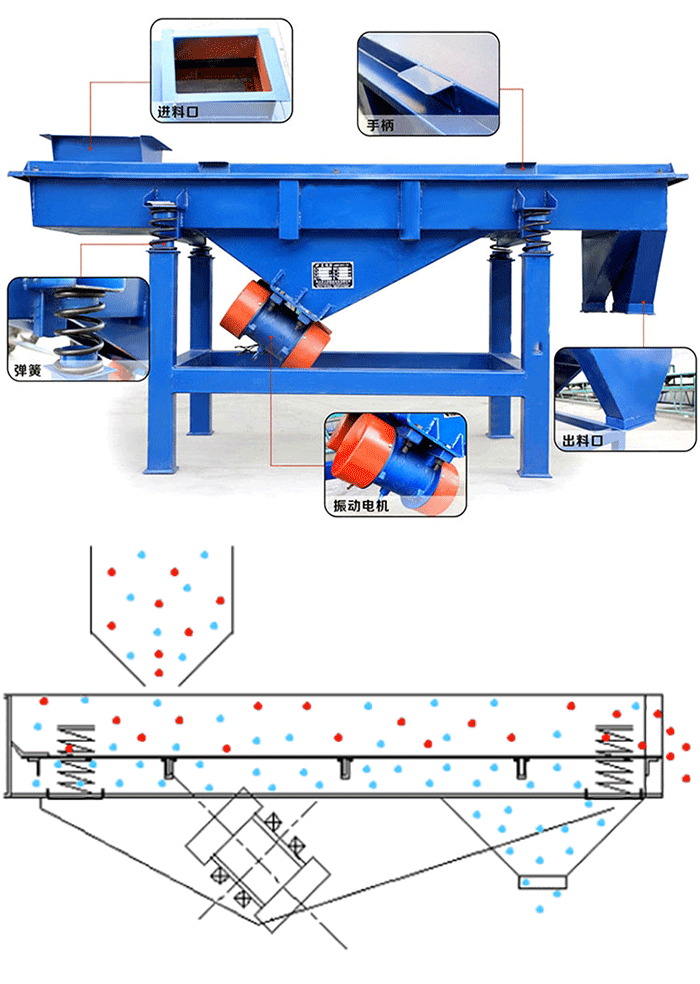直线振动筛是双振动电机驱动,当两台振动电机做同步、反向旋转时使用振动筛需要注意哪些细节呢?看这儿,其偏心块所产生的激振力在平行于电机轴线的方向相互抵消,在垂直于电机轴的方向叠为一合力,因此直线筛的运行轨迹为一直线。两电机轴相对筛面有一倾角,在激振力和物料自重力的合力作用下,物料在筛面上被抛起跳跃式向前作直线运动,从而达到对物料进行筛选和分级的目的。