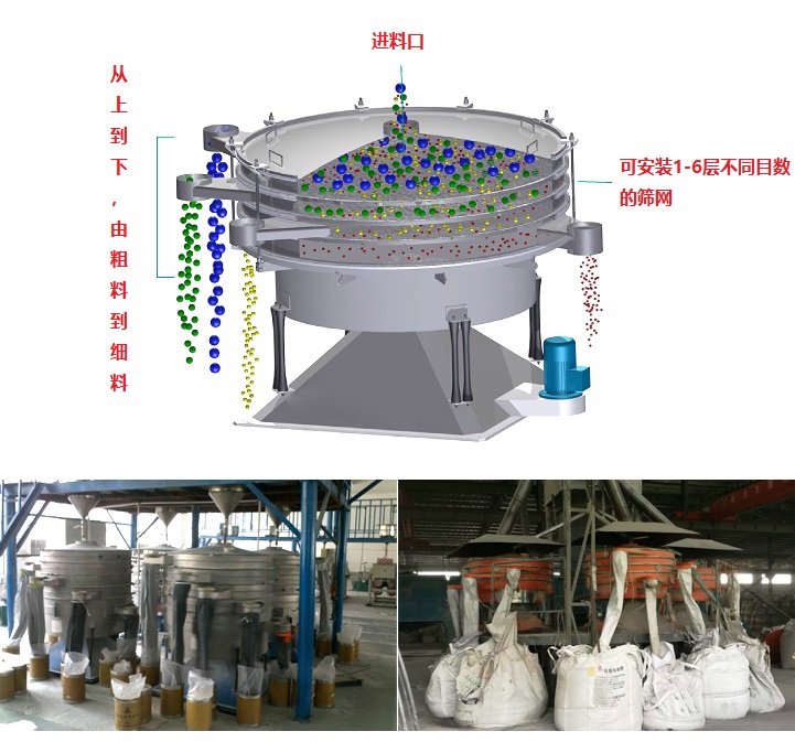 圆形摇摆筛采用仿人工筛分原理,用于准确分离1-6级粉粒,通常用于干燥、粉状、颗粒状产品的筛分、分级和除尘,特别适用于细、脆、轻等难于筛分的产品。
