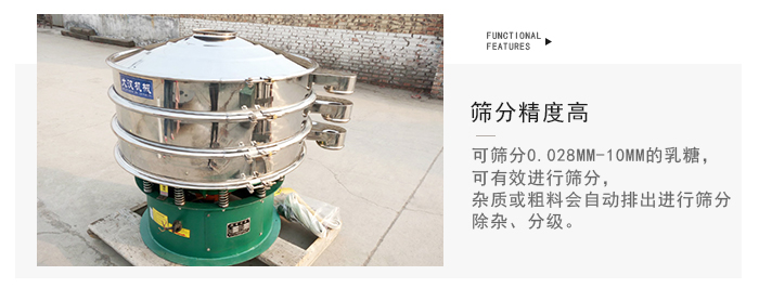 三次元振动筛是由立式振动电机作为激振源,电机上下两端安装有扇形的偏心块,筛分过程中将电机的旋转运动转变为水平、垂直、倾斜的三次元运动,再把这个运动传递给上端的筛面进行乳糖筛分。将筛分的乳糖沿着筛网筛面进行具有三次元运动改变物料轨迹的筛分运动,再通过筛面上不同尺寸大小的网孔分级过网,以达到不同的除杂分级的目的。
