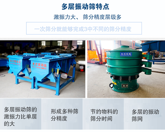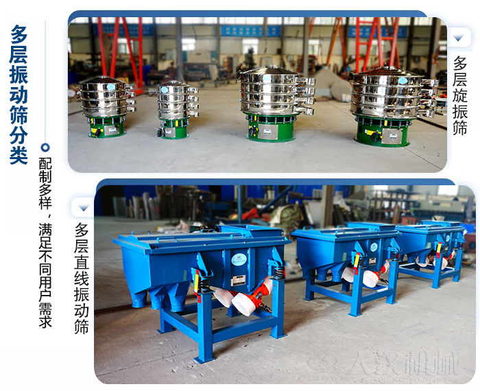多层振动筛可用于粉末,颗粒,液体物料筛分和分级,筛网有2-6层可选,可将物料筛分成3-6种不同规格粒度,分多层直线振动筛和多层旋振筛,材质有碳钢,不锈钢,塑料可选。