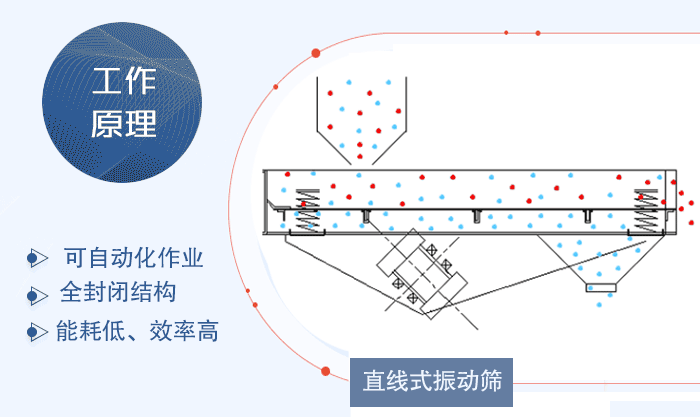 直线振动筛利用振动电机激振作为振动动力来源,使物料在筛网上被抛起,同时向前作直线运动,物料从给料机均匀地进入筛分机的进料口,通过多层筛网产生数种规格的筛上物、筛下物、分别从各自的出口排出。具有耗能低、产量高、结构简单、易维修、全封闭结构,无粉尘溢散,自动排料,更适合于流水线作业。
