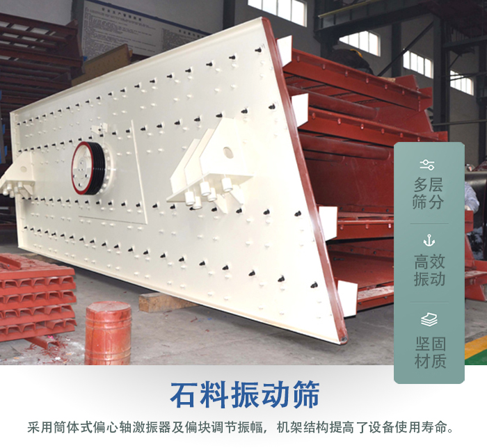 大汉机械生产的石料振动筛设备改良传统振动筛结构采用筒体式偏心轴激振器及偏块调节振幅,铆钉连接装配式机架结构提高了设备使用寿命及弹簧减振装置减小了对基础的冲击力。