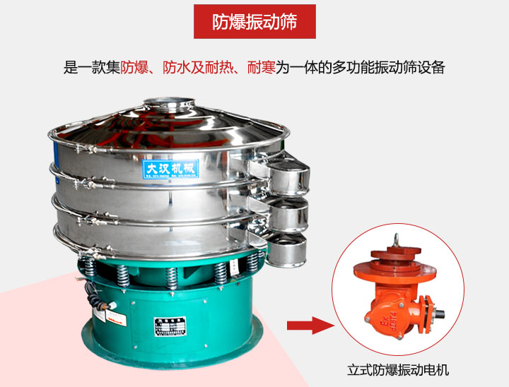 防爆振动筛是针对一些易产生爆炸行业的研发设计而成,是一款集防爆、防水及耐热、耐寒特殊要求的场合为一体的多功能振动筛设备,能够实现该功能主要原因是防爆振动筛采用的是立式防爆振动电机。
