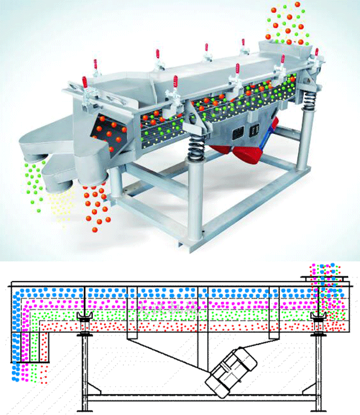 多层直线振动筛利用双台电机作为振动源,物料在筛网上受激振力的作用被抛起,同时向前做直线运动,物料从给料机均匀地进入直线筛佰利乐进料口后,通过多层筛网产生了数种不同规格的筛上物、筛下午,后分别又从各自的出口排出。