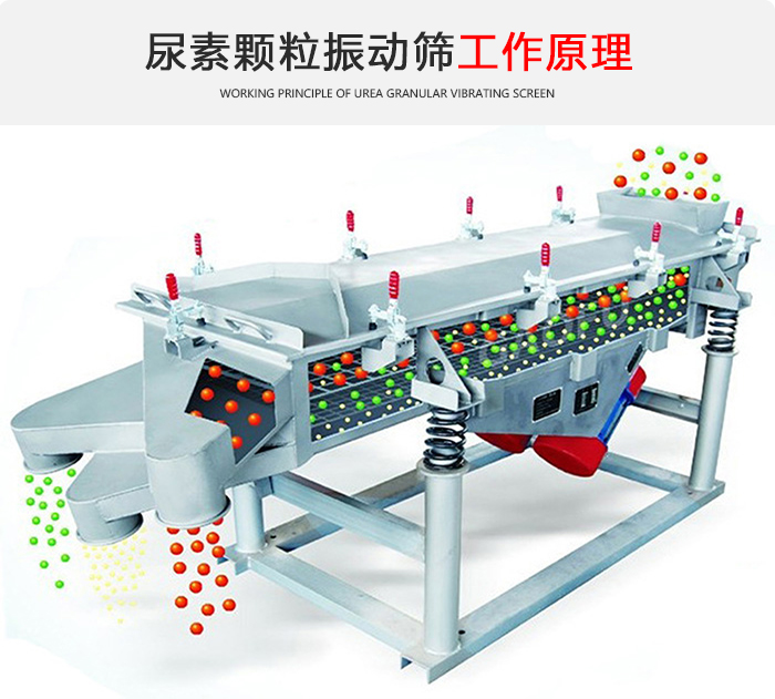 尿素颗粒振动筛主要由筛箱、筛框、筛网、振动电机、电机台座、减振弹簧、支架等组成。