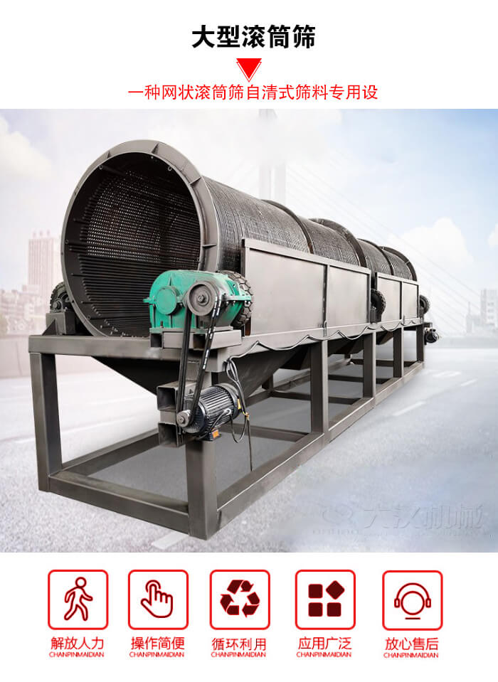 大型滚筒筛,因其独特的结构特点,完全有效地解决了其他型式筛分设备所存在的缺点,是综合利用电站的筛型。是继国内各大公司生产的普通型网状滚筒筛之后的自清式筛料专用设备。