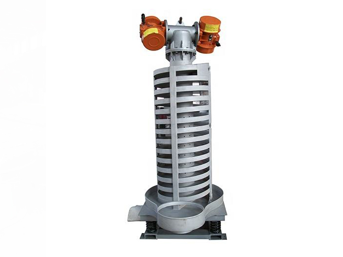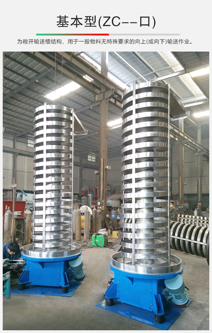 佰利乐 SZC系列垂直振动提升机的驱动装置振动电机安装在输送塔下部,两台振动电机对称交叉安装,输送塔由管体和焊接在管体周围的螺旋输送槽组成,输送塔座于减振装置上,减振装置由底座和隔振弹簧组成。当垂直输送机工作时,根据双振动电机自同步原理,由振动电机产生激振力,强迫整个输送塔体作水平圆运动和向上垂直运动的空间复合振动,螺旋槽内的物料则受输送槽的作用,作匀速抛掷圆运动,沿输送槽体向上运动,从而完成物料的向上(或向下)输送作业。
